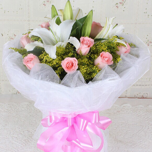 11朵粉玫瑰2枝白百合,黄...